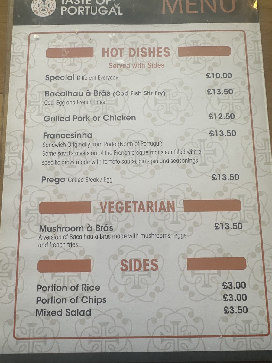 The star of the menu is undoubtedly the Bacalhau À Brás, a bacalhau dish that captures the heart and soul of Portugal at £10.00. For meat lovers, the Grilled Pork or Chicken and Francesinha at £12.50 and £13.50 respectively promise a taste sensation. Sides like Portion of Rice and Mixed Salad are perfect accompaniments, all priced affordably.